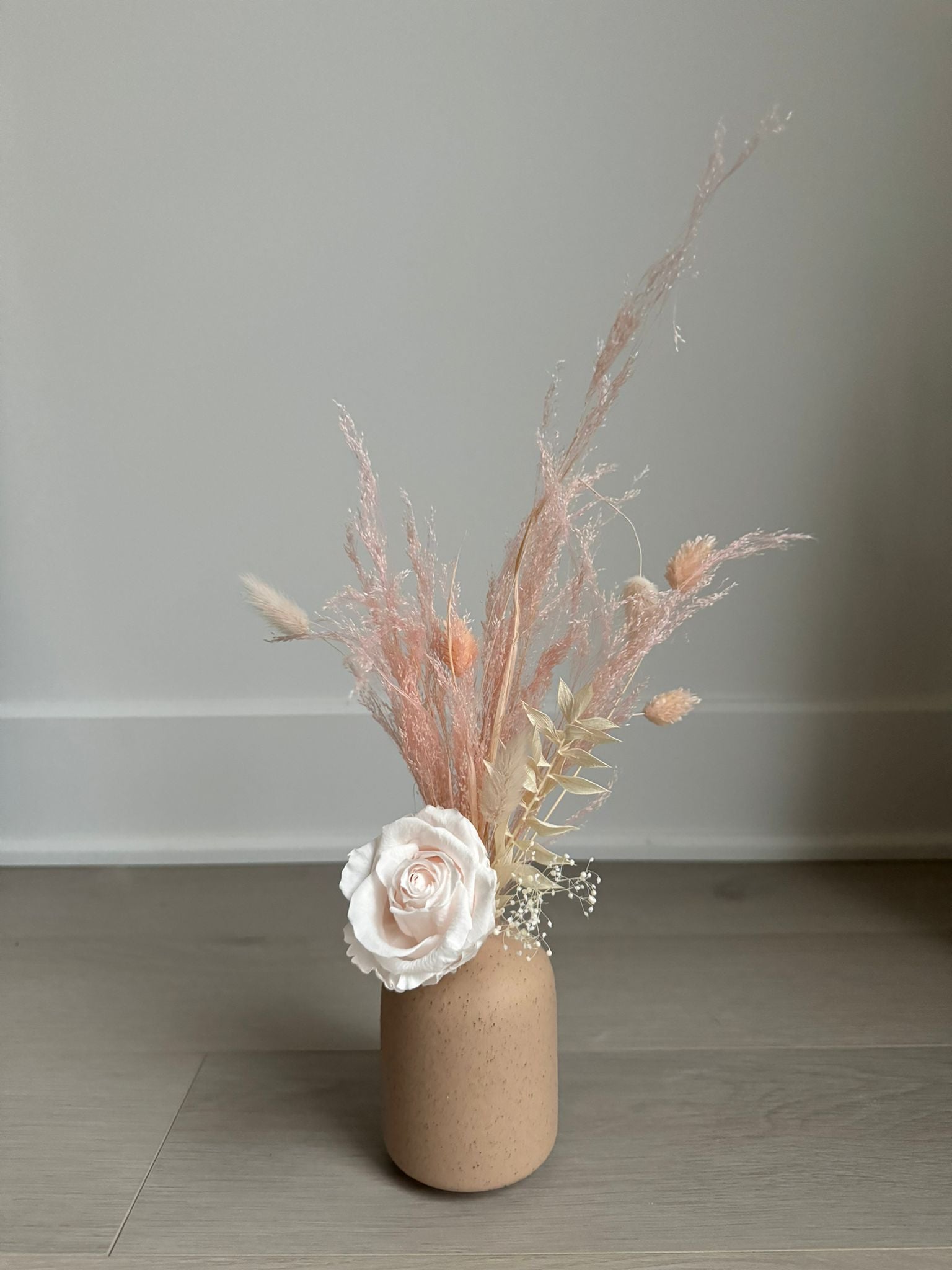 Add a natural and refined touch to your interior with our small concrete-style vase, highlighted by a classic eternal rose and a delicate selection of preserved flowers. Its minimalist design makes it the perfect choice for a baby’s room, office, or shelf.