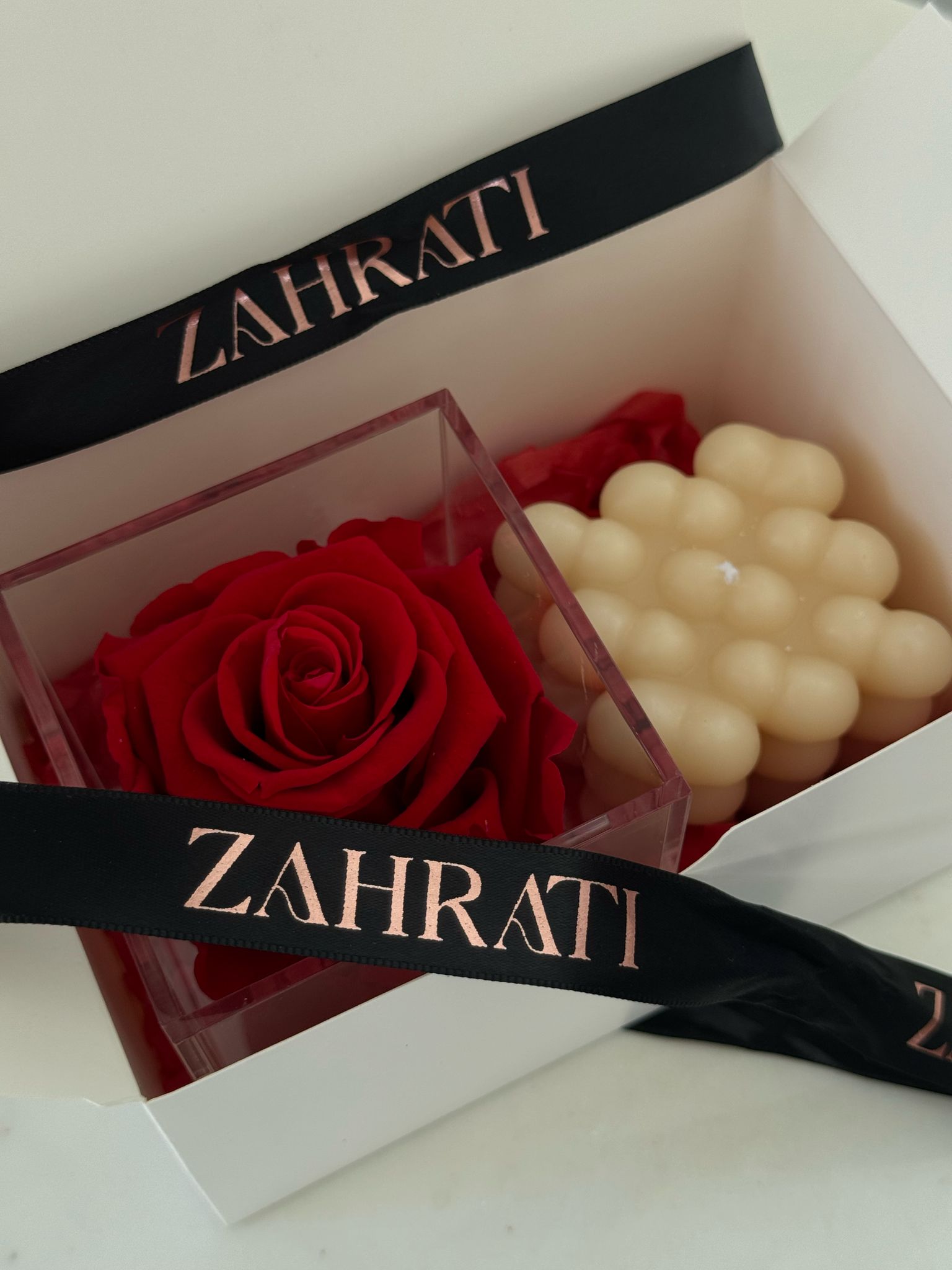 This exclusive gift box, featuring a stunning eternal rose and a heart-shaped cube candle. Perfectly designed to convey romance, this luxurious set makes an unforgettable gift for your loved one. The eternal rose adds timeless beauty, while the candle offers a soft, warm glow to create the perfect atmosphere of love and affection.