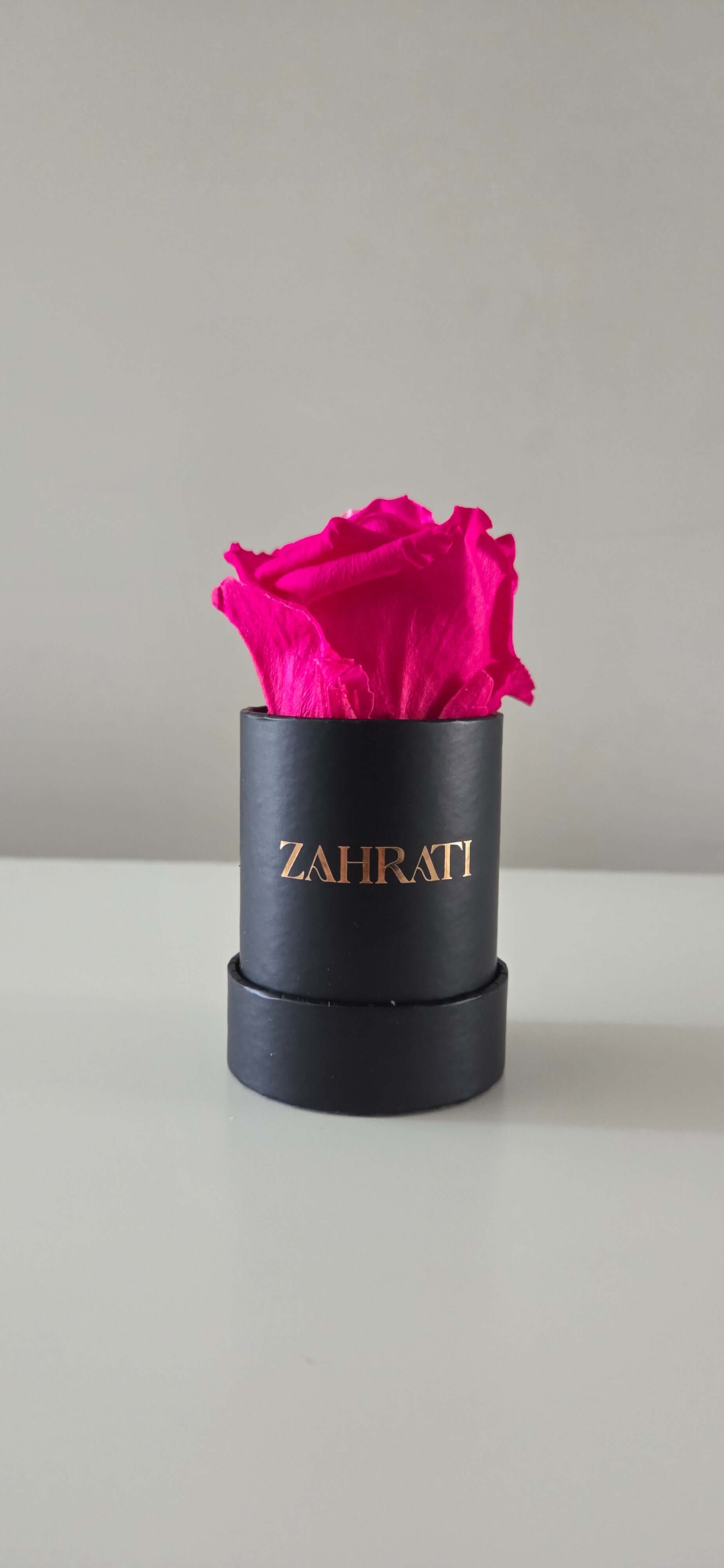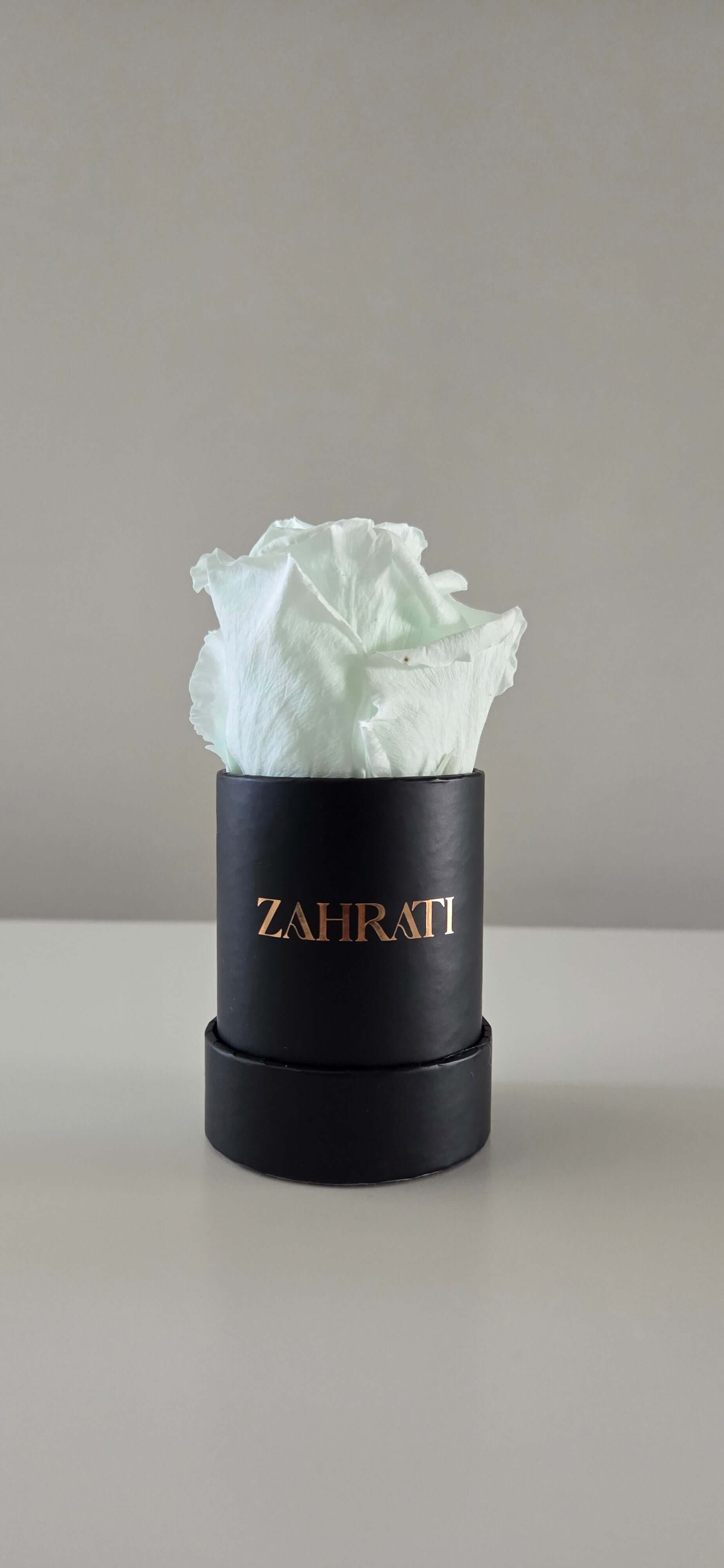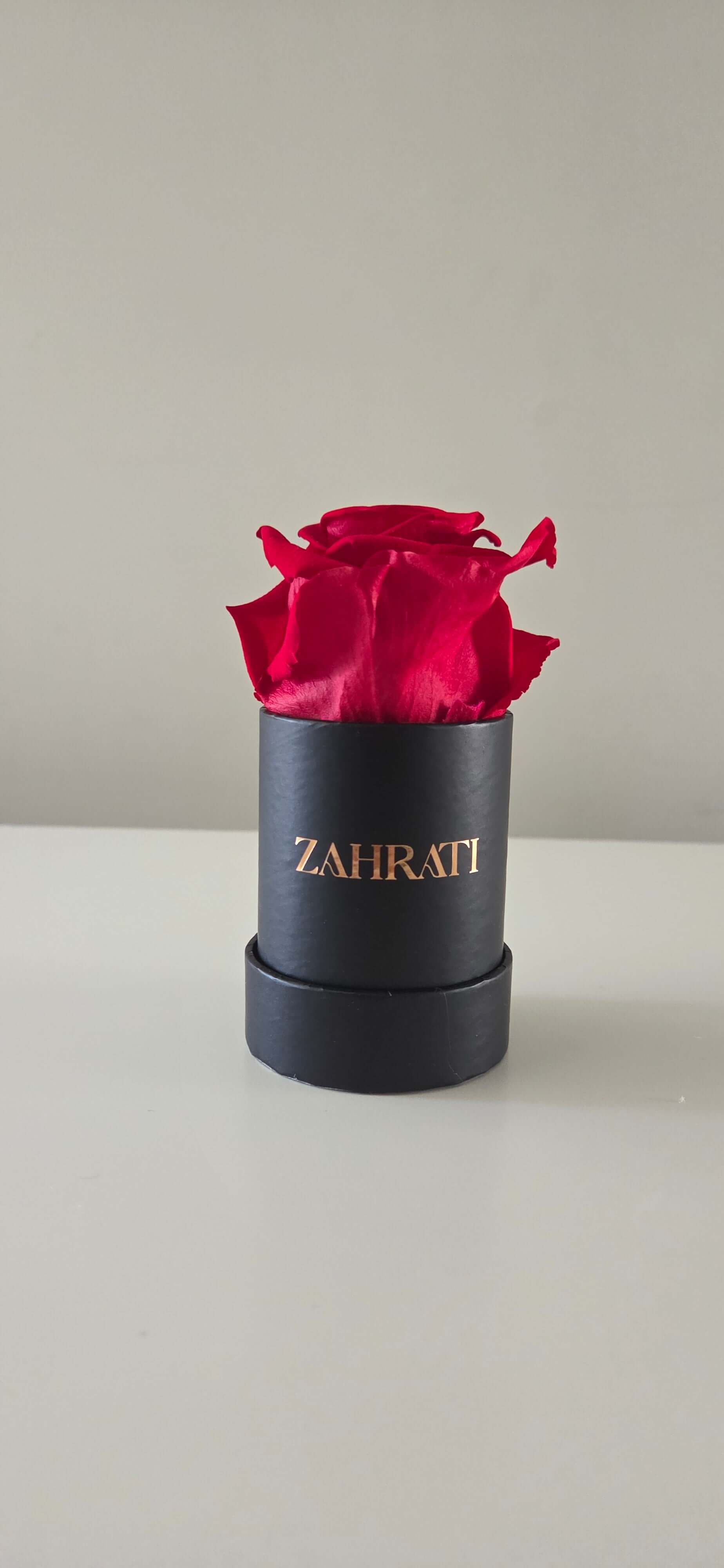 Unveil the beauty of the Jasmin arrangement, featuring a single eternal rose preserved to perfection, ensuring it maintains its vibrant charm for over a year with no maintenance required. This exquisite rose is elegantly displayed in a high-quality cardboard box, adding sophistication and luxury to any setting or occasion.